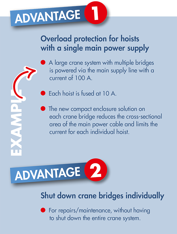 Operational downtime is generally a major issue. If a lifting device needs to be replaced or something needs to be repaired, the entire crane system comes to a standstill. To avoid this, Heiko Grüner “... looked for a custom solution that wasn’t available off-the-shelf.” Together with the engineers at Kraus & Naimer, a special combination of a KG 20A main switch, fuses, and space-saving double terminals for potential additional equipment was therefore developed in a very compact enclosure. This makes it possible to protect each crane bridge individually – even with a single supply line – and, above all, to shut them down separately without any issues. In compliance with VDE standards, a padlock can now be attached to the switch when it is in the off position. This allows lifting equipment or auxiliary applications such as vacuum lifters and magnets to be replaced or repaired safely without bringing the entire production line to a standstill.